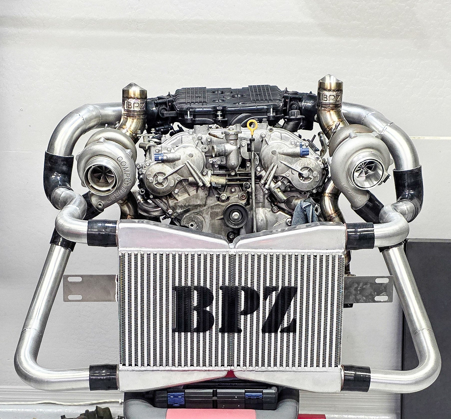 Twin turbo top mount kit. This kit is rated at 800+whp. It does work with oem ac lines. Turbos will sit under the hood. Only offering with hood exits.